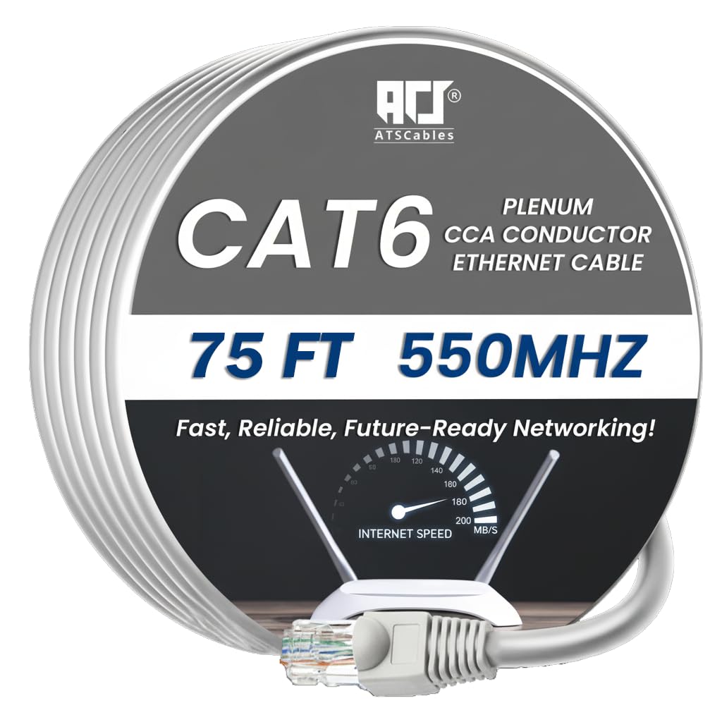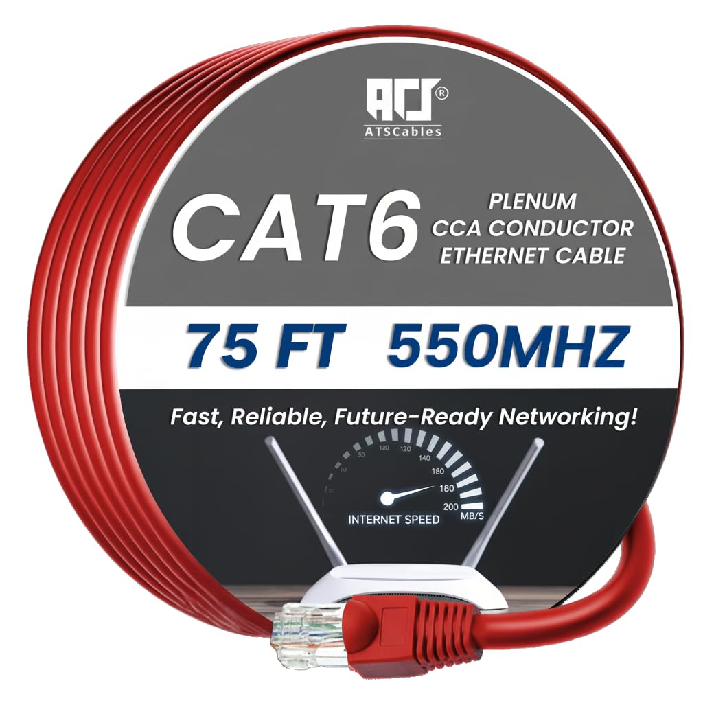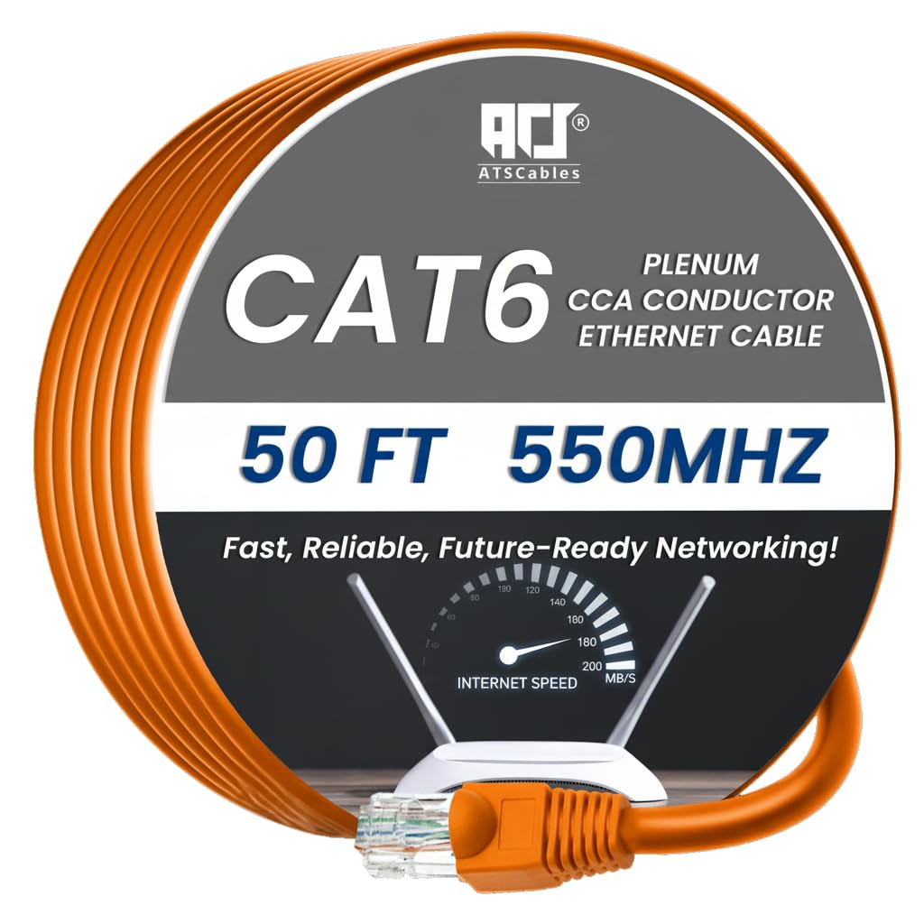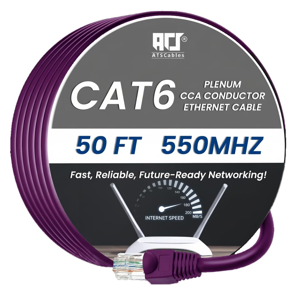 ATSCables CAT6 Plenum (CMP) UTP (Unshielded Twisted Pair) networking cable has enhanced performance and high 550MHz bandwidth capacity, fire retardant, meets, exceeds TIA/EIA 568-C.2 standards, and is RoHS compliant. Our CAT6 plenum cable comes in easy pull box packaging for smooth and easy installation, and is ideal for commercial and residential networking. 23 Awg copper clad aluminum conductor insulated with hdpe to stop extreme attacks Our CAT6 plenum (CMP) rated jacket Ethernet cable comes in multiple colors and is best for computers, printers, gaming consoles, routers, Ethernet extenders, switch boxes, VoIP phones, IP cameras.