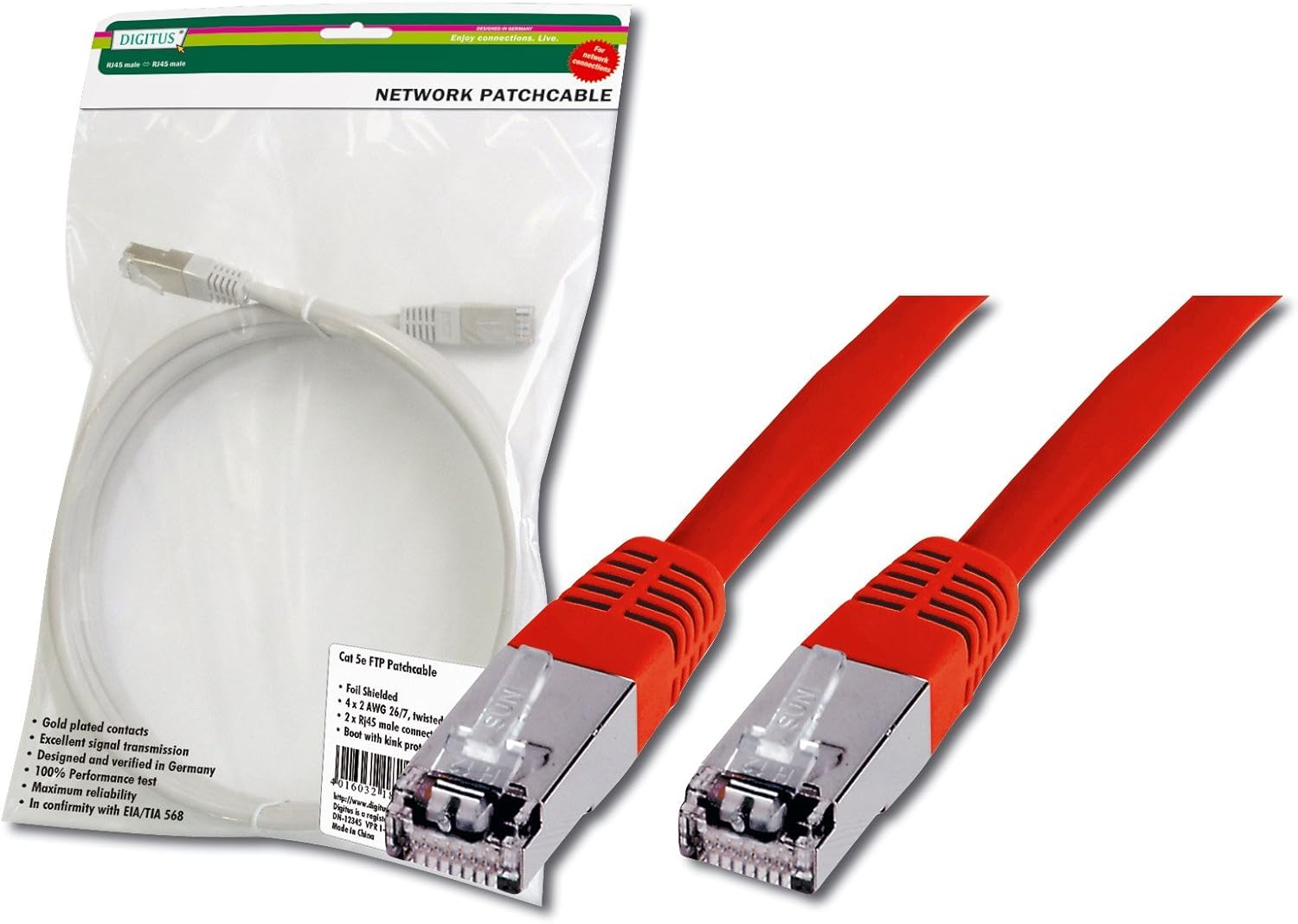 The DIGITUS® Category 6 Class E patch cords are manufactured and tested to the ISO/IEC 11801 and DIN EN 50173 Category 6 specifications. They will guarantee the installed cabling system is compliant with the ISO & EN channel specification requirements and will provide optimum performance levels of DIGITUS® Category 6 cabling. The performance is tested up to 250 MHz inclusive performance characteristics such as near end cross talk (“NEXT”). DIGITUS® patch cords are designed and produced to fulfill the highest requirements of various application areas in full volume. Each cable is fitted with a molded boot which comes with kink protection and strain relief. Furthermore the boot is equipped with a latch protection that prevents the latching lever against breaking. You can easily identify the Category 6, because of the transparent red colored connector.