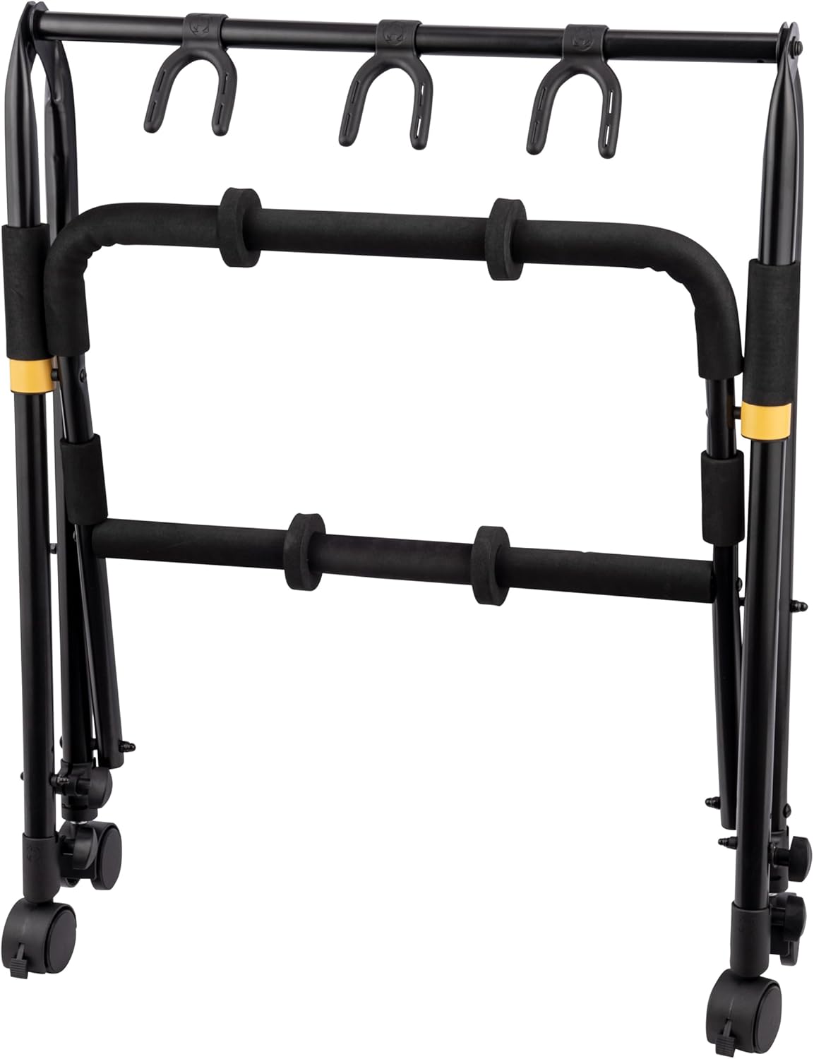 The Hercules GS523BPLUS Multi-guitar stand/rack accommodates three guitars easily and attractively. Perfect for stage, studio, or home this stand will allow you to display your guitars and basses securely, with easy access when needed. Locking casters provide smooth mobility and secure positioning when you need to move the rack.