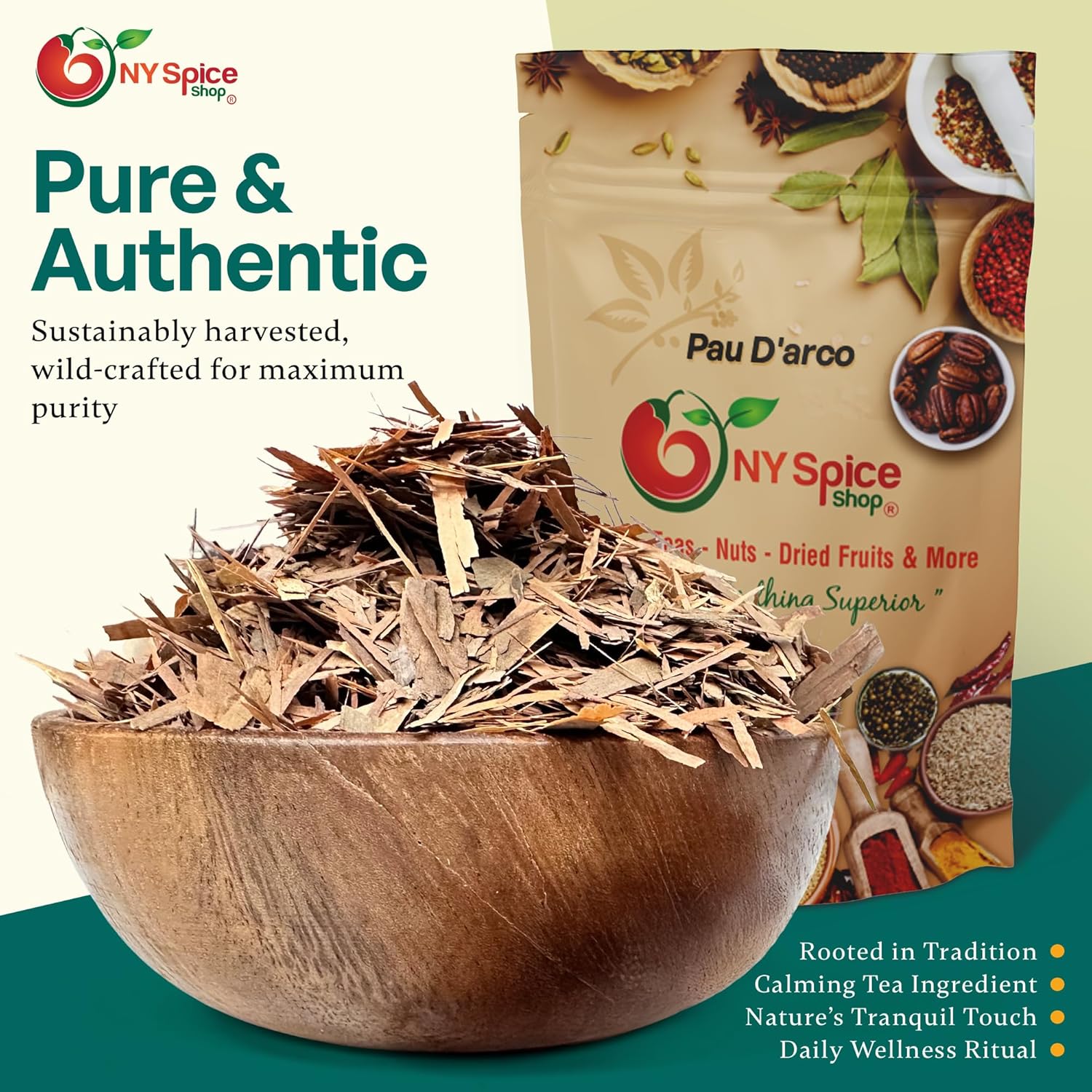 CUT AND SIFTED PAU D’ARCO INNER BARK NY Spice Shop Pau D’arco, also known as Ipe Roxo, consists of carefully prepared inner bark in a cut and sifted format. This structure maintains the natural character of the botanical material while offering practical handling for brewing and blending. The consistent cut size supports even extraction during simmering and infusion processes. TRADITIONAL HERBAL TEA PREPARATION The bark pieces are commonly used to prepare herbal tea through decoction-style brewing. When gently simmered in water, Pau D’arco develops a deep amber color and a distinctive woody aroma. The cut and sifted format allows for controlled measurement and easy straining after brewing, making it suitable for both single servings and larger batches. FLAVOR AND AROMA CHARACTERISTICS Pau D’arco offers a mild, earthy flavor with subtle woody undertones. The taste profile develops gradually during heating, allowing the infusion to reach a balanced and smooth character. It may be enjoyed on its own or combined with other herbs and spices to create custom tea blends with layered flavor notes. BLENDING AND CULINARY USE In addition to tea preparation, the inner bark may be incorporated into herbal beverage formulations and specialty culinary applications where a gentle woody essence is desired. The package provides flexibility for home preparation, herbal blending, and pantry storage, supporting a variety of traditional and modern uses.