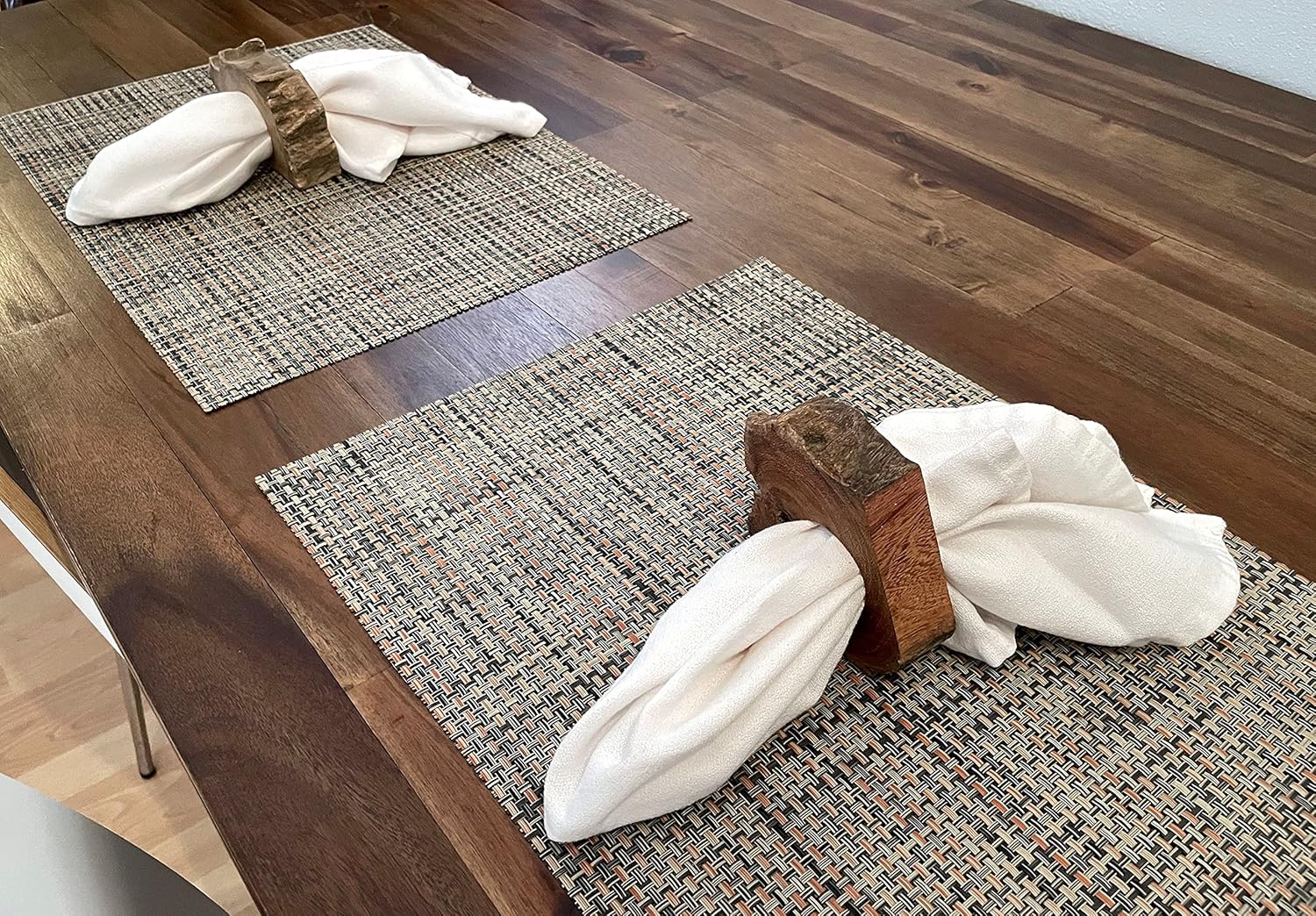 Crafted from authentic slices of sustainably sourced Acacia wood, this set of eight handmade napkin rings adds a rustic charm to your table setting. The natural, unfinished wood exudes an organic allure, making them perfect for both casual gatherings and formal dinners. Each ring features a 1.75-inch inner diameter, accommodating napkins of various sizes, ensuring your table is elegantly dressed for any occasion. These rings are not just functional; they serve as exquisite botanical design elements, enhancing your party table with a touch of nature's beauty. Their versatile design allows you to transform them into stylish centerpieces by placing tea lights or fresh-cut flowers in small glass holders, creating an inviting ambiance. The handcrafted nature of these rings ensures each piece bears a unique character, with organic textures that bring an earthy allure to your space. Their dimensions, averaging around 4 inches in length, 3 inches in width, and 1 inch in height, provide a substantial presence on your table. Please note that due to the natural materials used, each ring is one-of-a-kind, varying slightly in size and shape, making your table decor truly distinctive. Elevate your dining experience and infuse your space with the warmth of nature using these charming and unique wooden napkin rings.